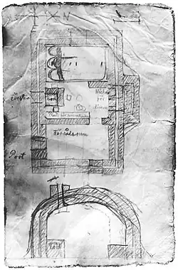 However, the floe began to break up directly under the hut on 2 October, from the stresses of pressing against Kvitøya, and they were forced to bring their stores on to the island itself, which took a couple of days. Despite these difficulties, Andrée recorded in his diary, "Morale remains good. With such comrades one should be able to manage under, I may say, any circumstances."[39][40] Strindberg's briefer diary entries indicate that on 5 October the party landed on the island. Strindberg then wrote "Snowstorm reconnaissance" on 6 October and what appeared to be the single word "Moving" on 7 October.[41] Later scientific analysis revealed the contents of the final pages of Andrée's diary, with its last entry on 8 October reading: "It feels fine to be able to sleep here on fast land as a contrast with the drifting ice out upon the ocean where we constantly heard the cracking, grinding, and din. We shall have to gather driftwood and bones of whales and will have to do some moving around when the weather permits."[42][43] It is inferred from the end of Strindberg's diary on 7 October and Andrée's on 8 October that the three men died shortly afterwards.[44][43]