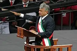 Described as being center-left, progressive, a left-wing populist, social democratic, and an economic nationalist,[10] López Obrador was a national politician for over three decades.[11] During his presidency, he promoted public investment in sectors that had been liberalized under previous administrations and implemented several progressive social reforms. Supporters praised him for promoting institutional renewal after decades of high inequality and corruption and refocusing the country's neoliberal consensus towards improving the state of the working class.[12] Conversely, López Obrador has been criticized for contributing to democratic backsliding,[13][14] failing to adequately respond to the COVID-19 pandemic, and attempting to appease drug cartels.[15] He left office in September 2024, succeeded by his chosen successor Claudia Sheinbaum, and retired from both electoral politics and public life.[2]