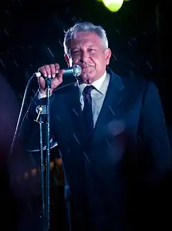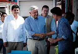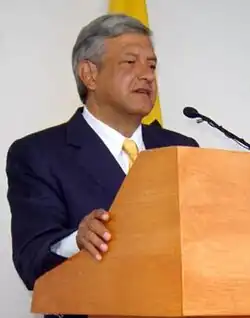 Born in Tepetitán, in the municipality of Macuspana,[4] in the south-eastern state of Tabasco, López Obrador earned a degree in political science from the National Autonomous University of Mexico following a hiatus from his studies to participate in politics. He began his political career in 1976 as a member of the Institutional Revolutionary Party (PRI). His first public position was as director of the Indigenous Institute of Tabasco, where he promoted the addition of books in indigenous languages. In 1989, he joined the Party of the Democratic Revolution (PRD), becoming the party's 1994 candidate for Governor of Tabasco and national leader between 1996 and 1999. In 2000, he was elected Head of Government of Mexico City. During his tenure, his crime, infrastructure, and social spending policies made him a popular figure on the Mexican left.[5] In 2004, his state immunity from prosecution was removed after he refused to cease construction on land allegedly expropriated by his predecessor, Rosario Robles. This legal process lasted a year, ending with López Obrador maintaining his right to run for office.[6]