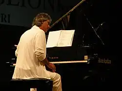 Bocelli also spent time singing during his childhood.[24] He gave his first concert in a small village not far from where he was born.[21] He won his first song competition at age 14 with "'O sole mio" at the Margherita d'Oro in Viareggio.[24] He finished secondary school in 1980, and then studied law at the University of Pisa.[25][18] To earn money, he performed evenings in piano bars, and it was there that he met his future wife Enrica in 1987.[18] He completed law school and spent one year as a court-appointed lawyer.[26]