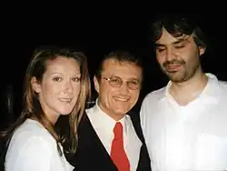 In 1998, Bocelli was named one of People magazine's 50 Most Beautiful People.[14] He duetted with Celine Dion on the song "The Prayer" for the animated film Quest for Camelot, which won the Golden Globe Award for Best Original Song and was nominated for the Academy Award for Best Original Song.[5] In 1999, he was nominated for Best New Artist at the Grammy Awards. He captured a listing in the Guinness Book of World Records with the release of his classical album Sacred Arias, as he simultaneously held the top three positions on the US Classical Albums charts.[5]