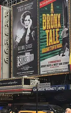 In April 2016, the English National Opera staged a revival of Sunset Boulevard at the London Coliseum.[87] The limited run, semi-staged production directed by Lonny Price brought Glenn Close to reprise her star turn as Norma Desmond, which was her first time performing the role in London; she had originated the role in Los Angeles in December 1993 and then on Broadway in November 1994 (which won her the 1995 Tony Award for Best Actress in a Musical). The 2016 London revival was so well-received that the production transferred to the Palace Theatre on Broadway in February 2017, making Lloyd Webber the first musical-theatre composer since 1953 to have four musicals running simultaneously on Broadway – a feat that his heroes Rodgers and Hammerstein had previously achieved.[88][89]