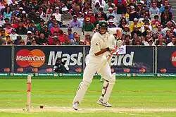 In March 2004, Symonds made his Test debut in Australia's tour of Sri Lanka, with the selectors citing his bowling and his power hitting against spin bowlers as "ideal" for the subcontinent conditions.[54] He replaced Simon Katich, who had scored a century and unbeaten fifty in Australia's previous Test.[61] Playing as a batsman, Symonds encountered difficulty against Muttiah Muralitharan on the dusty, spinning Sri Lankan tracks, failing to pass 25 in any of his four innings,[62] and was dropped after two Test matches in favour of Katich.[63]