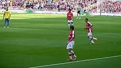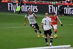 On 27 November 2010, Arshavin scored his first goal since September, which was the opening goal against Aston Villa in a 4–2 away win.[44] On 29 December 2010, Arshavin scored a scissor kick volley to bring Arsenal level when they were 1–0 down to Wigan Athletic. He later made an assist for Nicklas Bendtner to put Arsenal 2–1 up, but after a Sébastien Squillaci own goal, the match ended 2–2.[45] He then won the Man of the Match award for best performance by Arsenal fans for the second time.[46]
