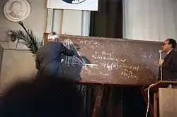 Kolmogorov (left) delivers a talk at a Soviet information theory symposium. (Tallinn, 1973).