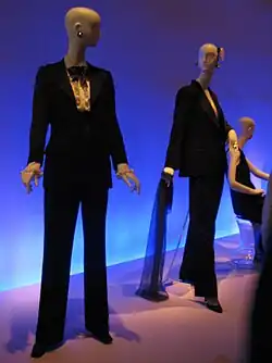 Throughout the 1960s and 1970s, the women's liberation movement is likely to have contributed to ideas and influenced fashion designers, such as Yves Saint Laurent.[52] Yves Saint Laurent designed the Le Smoking suit and introduced it in 1966, while Helmut Newton's erotized androgynous photographs of the suit made it iconic and a classic.[53]