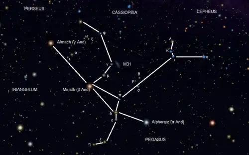 Photo of the constellation Andromeda, as it appears to the naked eye. Lines have been added for clarity.