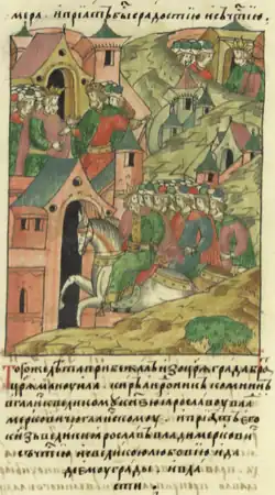 Andronikos first spent some time in Halych, where he was briefly captured by Vlachs from Moldavia[22] who intended to bring him back to Manuel.[20] During his captivity, Andronikos pretended to suffer from infectious diarrhea, requiring frequent stops to dismount and defecate alone and at a distance. One night, he made a dummy out of his cloak, hat, and staff, in the position of a man defecating. While the Vlachs watched the dummy, Andronikos managed to escape.[23] He then made his way to Galicia, where he was well received by Prince Yaroslav Osmomysl.[24]