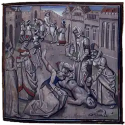 Soon after Andronikos gained control of Constantinople in April 1182, the Massacre of the Latins erupted in the city.[45] Andronikos made no effort to stop the pogroms, instead referring to them as a "defeat of the tyranny of the Latins" and a "restoration of Roman affairs". There is no evidence that Andronikos was particularly anti-Latin on a personal level but the massacre was politically useful since anti-Latin sentiment had helped bring him to power and because many Latins in the city had supported Maria of Antioch's regency.[2] The bulk of Constantinople's Latin population were either killed or forced to flee[46] and the Latin quarters were plundered and set on fire.[2] According to Eustathius of Thessalonica, approximately 60,000 people were killed[46][47] though this number is likely exaggerated.[47] A papal delegate visiting Constantinople was decapitated and his head was tied to the tail of a dog.[2]