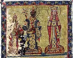 In the place of Manuel's officials, Andronikos raised up his own loyalists, such as Michael Haploucheir and Stephen Hagiochristophorites.[44] The execution of Maria of Antioch left the young Alexios II without protection.[48] Andronikos had some of the clergy formally absolve him of his oaths to Manuel and Alexios II[49] and was crowned as co-emperor in September 1183.[50] Soon thereafter, Alexios II was strangled and his body was thrown in the sea, encased in lead.[48] Just over a year after taking power as the young emperor's guardian, Andronikos had thus had him suppressed and killed[1] and now ruled in his own name.[50]
