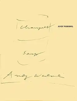 To promote himself as an artist, Warhol produced and distributed self-published books of his illustrations, including 25 Cats Name Sam and One Blue Pussy (1957) and A Gold Book (1957), which he gave to potential clients and contacts to generate work.[56][57] He frequently incorporated calligraphy by his mother, Julia Warhol, to accompany his drawings.[58]