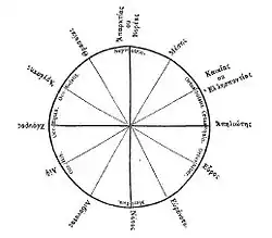 Eurus (Εὖρος, Euros) according to some was the southeast wind, but according to others the east wind.[7] On the Tower of the Winds in Athens, Eurus occupies the southeast side, while Apeliotes is in the east. However, it is widely accepted that Eurus is the east wind, while Apeliotes is the southeast wind.