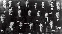 At the age of 13, in his last months of schooling, he worked as a butcher's boy at a local store.[6] He worked at the butcher's for several months before leaving school, instead working in the local Ty-Trist Colliery. There he earned around ten shillings per week with most going to his parents to help support the family. He began attending fortnightly meetings of the local Plebs' League where he studied, among other things, Marxism.[5] Bevan also joined the Tredegar branch of the South Wales Miners' Federation and became a trade union activist: he was head of his local Miners' Lodge at 19 years of age. He was called up for service during the First World War, and was briefly arrested when his sister Blodwen burnt his conscription papers and he failed to report for duty. Bevan appeared in court but was cleared when he produced confirmation that he suffered from nystagmus.[7]