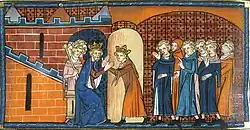 By 1166, it became apparent that Conan was unable to independently maintain order in Brittany, and in response Henry seized control.[96] He betrothed Conan's daughter and heir Constance to his son Geoffrey and took possession of the duchy in Geoffrey's name.[97] At Thouars, Henry received homage from most of the Breton nobles, and then went on to Rennes where the Breton dukes had historically been invested in the city's cathedral.[98] Over the following years, some nobles continued to rebel against Angevin rule, but Henry responded to each rebellion with confiscations of territory and castles.[99] By 1169, the duchy was firmly under Angevin control,[100] with Geoffrey receiving homage from the Breton nobles at Rennes.[101]