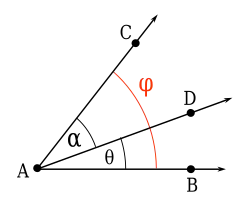 The angle addition postulate states that if D is a point lying in the interior of then:[18] This relationship defines what it means to add any two angles: their vertices are placed together while sharing a side to create a new larger angle. The measure of the new larger angle is the sum of the measures of the two angles. Subtraction follows from rearrangement of the formula.[18]