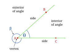It is common to consider that the sides of the angle divide the plane into two regions called the interior of the angle and the exterior of the angle. The interior of the angle is also referred to as an angular sector.[7][8][a]