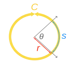 The ratio of the length s by the radius r is the number of radians in the angle,[35] while the ratio of length s by the circumference C is the number of turns: