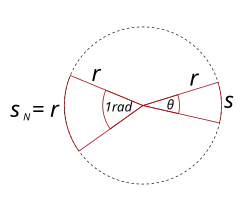 An arc with length s is formed as the perimeter between the two points of intersection, which is said to subtend the angle. The length s can be used to measure the angle's size θ, however as s is dependent on the size of the circle chosen, the measure must be scaled. This can be done by taking the ratio of s to either the radius r or circumference C of the circle.
