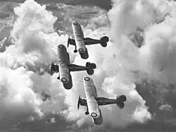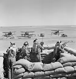 The air force had 116 aircraft in seven squadrons, of which 50 to 60 were serviceable, and a training school.[18][10] Most Iraqi fighter and bomber aircraft were at "Rashid Airfield" in Baghdad (formerly RAF Hinaidi) or in Mosul. Four squadrons and the Flying Training School were based in Baghdad. Two squadrons with close co-operation and general-purpose aircraft were based in Mosul. The Iraqis flew an assortment of aircraft types including Gloster Gladiator biplane fighters, Breda 65 fighter bombers, Savoia SM 79 medium bombers, Northrop/Douglas 8A fighter bombers, Hawker Hart (Hawker Nisr) biplane close co-operation aircraft, Vickers Vincent biplane light bombers, de Havilland Dragon biplane general purpose aircraft, de Havilland Dragonfly biplane general purpose aircraft and Tiger Moth biplane trainers. The air force had another nine aircraft not allocated to squadrons and 19 aircraft in reserve.[18]