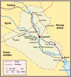 After 1937, no British troops were left in Iraq and the government had become solely responsible for internal security.[28] The Royal Air Force (RAF) had been allowed to retain two bases: RAF Shaibah, near Basra and RAF Habbaniya (Air Vice-Marshal Harry George Smart, also air officer commanding RAF Iraq Command), between Ramadi and Fallujah.[29][30] The bases protected British petroleum interests and were a link in the air route between Egypt and India.[29] At the beginning of the Second World War, RAF Habbaniya became a training base, protected by No. 1 Armoured Car Company RAF and locally raised mainly Assyrian troops, the RAF Iraq Levies, sometimes known as Assyrian levies.[31][32]