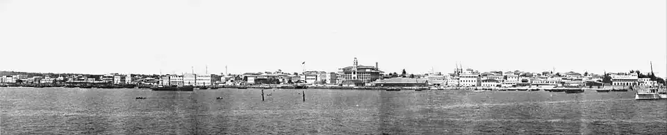 The subsequent sultans established their capital and seat of government at Zanzibar Town where a palace complex was built on the sea front. By 1896, this consisted of the palace itself; the Beit al-Hukm, an attached harem; and the Beit al-Ajaib or "House of Wonders"—a ceremonial palace said to be the first building in East Africa to be provided with electricity.[7] The complex was mostly constructed of local timber and was not designed as a defensive structure.[8] All three main buildings were adjacent to one another in a line and linked by wooden covered bridges above street height.[9]