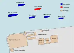 The badly damaged palace complex was completely changed by the war. The harem, lighthouse and palace were demolished as the bombardment had left them unsafe.[41] The palace site became an area of gardens, while a new palace was erected on the site of the harem.[9][48] The House of Wonders was almost undamaged and would later become the main secretariat for the British governing authorities.[40][49] During renovation work on the House of Wonders in 1897, a clocktower was added to its frontage to replace the lighthouse lost to the shelling.[48] The wreck of Glasgow remained in the harbour in front of the palace, where the shallow waters ensured that her masts would remain visible for several years to come; it was eventually broken up for scrap in 1912.[50]