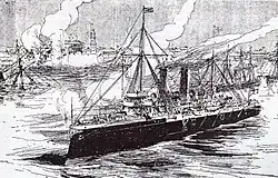 During the bombardment a small naval engagement occurred when, at 09:05, the obsolete Glasgow fired upon the St George using her armament of 7 nine-pounder guns and a Gatling gun, which had been a present from Queen Victoria to the sultan.[37] The return fire caused Glasgow to sink, though the shallow harbour meant that her masts remained out of the water.[1] Glasgow's crew hoisted a British flag as a token of their surrender, and they were all rescued by British sailors in launches.[1] Thrush also sank two steam launches whose Zanzibari crews shot at her with rifles. Some land fighting occurred when Khalid's men fired on Raikes' askaris, with little effect, as they approached the palace.[1] The fighting ceased with the end of the shelling. The British controlled the town and the palace, and by the afternoon Hamoud bin Muhammed, an Arab favourable to the British, had been installed as sultan with much reduced powers.[38] The British ships and crews had fired around 500 shells, 4,100 machine gun rounds and 1,000 rifle rounds during the engagement.[39]
