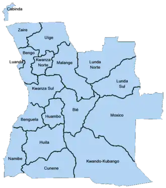 Map of the present provinces of Angola, corresponding almost exactly to the Portuguese-era districts.