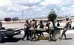 A Portuguese F-84 being loaded with ordnance in the 1960s, at Luanda Air Base, during the Portuguese Colonial War.