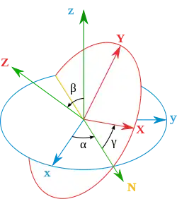 • The line of nodes of the moving frame with respect to the reference frame (nutation axis)