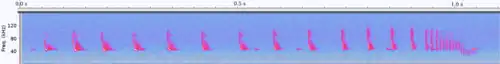 Spectrogram of Pipistrellus pipistrellus bat vocalizations during prey approach. The recording covers a total of 1.1 seconds; lower main frequency c. 45 kHz (as typical for a common pipistrelle). About 150 milliseconds before final contact time between and duration of calls are becoming much shorter ("feeding buzz").
