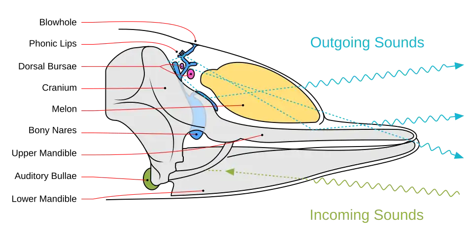 Diagram illustrating sound generation, propagation and reception in a toothed whale. Outgoing sounds are cyan and incoming ones are green.