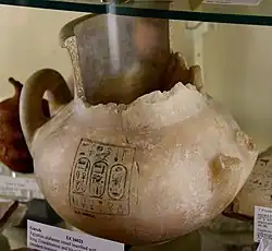 A blue glass ring of unknown provenance obtained in 1931 depicts the prenomen of Ay and the name of Ankhesenamun enclosed in cartouches.[9] This indicates that Ankhesenamun married Ay shortly before she disappeared from history, although no monuments show her as great royal wife to him.[10] On the walls of Ay's tomb it is Tey (Ay's senior wife), not Ankhesenamun, who appears as his great royal wife. She probably died during or shortly after his reign and no burial has been found for her yet.