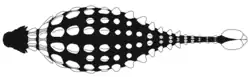 The first osteoderms behind the second cervical half-ring would have been similar in shape to those in the first half-ring, and the osteoderms on the back probably decreased in diameter hindwards. The largest osteoderms were probably arranged in transverse and longitudinal rows across most of the body, with four or five transverse rows separated by creases in the skin. The osteoderms on the flanks would probably have had a more square outline than those on the back. There may have been four longitudinal rows of osteoderms on the flanks. Unlike some basal ankylosaurs and many nodosaurs, ankylosaurids do not appear to have had co-ossified pelvic shields above their hips. Some osteoderms without keels may have been placed above the hip region of Ankylosaurus, as in Euoplocephalus. Ankylosaurus may have had three or four transverse rows of circular osteoderms over the pelvic region, which were smaller than those on the rest of the body, as in Scolosaurus. Smaller, triangular osteoderms may have been present on the sides of the pelvis. Flattened, pointed plates resemble those on the sides of the tail of Saichania, and may have been distributed similarly on Ankylosaurus. Osteoderms with oval keels could have been placed on the upper side of the tail or the side of the limbs. Compressed, triangular osteoderms found with Ankylosaurus specimens may have been placed on the sides of the pelvis or the tail. Ovoid, keeled, and teardrop-shaped osteoderms are known from Ankylosaurus, and may have been placed on the forelimbs, like those known from Pinacosaurus, but it is unknown whether the hindlimbs bore osteoderms.[10][12]