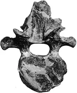 The cervical vertebrae had broad neural spines that increased in height towards the body. The front part of the neural spines had well-developed entheses, which was common among adult dinosaurs, and indicates the presence of large ligaments, which helped support the massive head. The dorsal vertebrae had centra (or bodies) that were short relative to their width, and their neural spines were short and narrow. The dorsal vertebrae were tightly spaced, which limited the downwards movement of the back. The neural spines had ossified (turned to bone) tendons, which also overlapped some of the vertebrae. The ribs of the last four back vertebrae were fused to the diapophyses and parapophyses (the structures that articulated the ribs with the vertebrae), and the ribcage was very broad in this part of the body. The caudal vertebrae had centra that were slightly amphicoelous, meaning they were concave on both sides.[10]