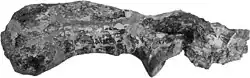 The structure of much of the skeleton of Ankylosaurus, including most of the pelvis, tail, and feet, is still unknown.[10] It was quadrupedal, and its hind limbs were longer than its forelimbs.[17] In the holotype specimen, the scapula (shoulder blade) measures 61.5 cm (2 ft 1⁄4 in) long and was fused with the coracoid (a rectangular bone connected to the lower end of the scapula). It also had entheses (connective tissue) for various muscle attachments. The humerus (upper arm bone) of AMNH 5214 was short, very broad and about 54 cm (1 ft 9+1⁄2 in) long. The femur (thigh bone), also from AMNH 5214, was 67 cm (2 ft 2+1⁄2 in) long and very robust. While the feet of Ankylosaurus are incompletely known, the hindfeet probably had three toes, as is the case in advanced ankylosaurids.[10]