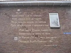 She had little food and almost no money; her son was denied access to study at academic institutions because of his parents' alleged anti-state activities.[34] The nationwide repression and purges decimated her Saint Petersburg circle of friends, artists and intellectuals. Her close friend and fellow poet Mandelstam was deported and then sentenced to a Gulag labour camp, where he would die. Akhmatova narrowly escaped arrest, though her son Lev was imprisoned on numerous occasions by the Stalinist regime, accused of counterrevolutionary activity.[36] She would often queue for hours to deliver him food packages and plead on his behalf. She describes standing outside a stone prison: