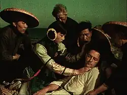 In 1926, Wong put the first rivet into the structure of Grauman's Chinese Theatre when she joined Norma Talmadge for its groundbreaking ceremony, although she was not invited to leave her hand- and foot-prints in cement.[50][51] Wong and Talmadge also turned the first spadeful of earth using a gold-plated shovel.[52] In the same year, Wong starred in The Silk Bouquet. Re-titled The Dragon Horse in 1927, the film was one of the first U.S. films to be produced with Chinese backing, provided by San Francisco's Chinese Six Companies. The story was set in China during the Ming dynasty and featured Asian actors playing the Asian roles.[53]