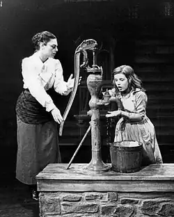 Bancroft won the Tony Award for Best Actress in a Play in 1960, again with playwright Gibson and director Penn, when she played Annie Sullivan, the young woman who teaches the child Helen Keller to communicate in The Miracle Worker.[14] She reprised her role in the 1962 film and won the Academy Award for Best Actress, with Patty Duke repeating her own success as Keller alongside Bancroft.[15] As Bancroft had returned to Broadway to star in Mother Courage and Her Children, Joan Crawford accepted the Oscar on her behalf and later presented the award to her in New York.[16]