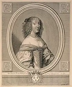 Anne Marie Louise d'Orléans, Duchess of Montpensier, (French pronunciation: [an maʁi lwiz dɔʁleɑ̃], 29 May 1627 – 5 April 1693) known as La Grande Mademoiselle ([la ɡʁɑ̃d madmwazɛl], lit. 'The Great Miss'), was the only daughter of Gaston d'Orléans with his first wife, Marie de Bourbon, Duchess of Montpensier. One of the greatest heiresses in history, she died unmarried and childless, leaving her vast fortune to her cousin Philippe I, Duke of Orléans.[1] After a string of proposals from various members of European ruling families, including Charles II of England,[2] Afonso VI of Portugal, and Charles Emmanuel II of Savoy, she eventually fell in love with the courtier Antoine Nompar de Caumont and scandalised the court of France when she asked Louis XIV for permission to marry him, as such a union was viewed as a mésalliance. She is best remembered for her role in the Fronde, for bringing the composer Jean-Baptiste Lully to the king's court,[3] and for her Mémoires.