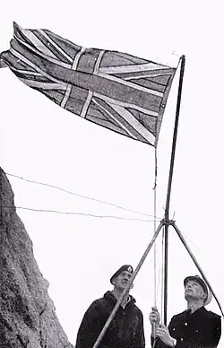 On 18 September 1955 at precisely 10:16 am, Rockall was declared officially annexed by the British Crown when Lieutenant-Commander Desmond Scott RN, Sergeant Brian Peel RM, Corporal AA Fraser RM, and James Fisher (a civilian naturalist and former Royal Marine), were deposited on the island by a Royal Navy helicopter from HMS Vidal (coincidentally named after the man who first charted the island). The team cemented in a brass plaque on Hall's Ledge and hoisted the Union Flag to stake the UK's claim.[65] However, any effect of this annexation on valuable maritime rights claims under UNCLOS in the waters beyond 12 nautical miles from Rockall is neither claimed by Britain nor recognised by Denmark (for the Faroe Islands), Iceland or Ireland.