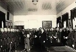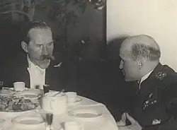 Smetona was known for his tolerant stance towards Jews and his radical opponents nicknamed him as "Jewish King".[32][33] Under Smetona's rule in Lithuania, not a single anti-Jewish law was passed and high-ranking Lithuanian officials, including ministers, did not publicly say anti-Jewish statements.[33] Smetona considered Jews not as foreigners, but as Lithuanian citizens of foreign nationality and himself acted against antisemitic acts with his statements which were later followed by actions of governmental institutions (e.g. censorship).[33] The Lithuanian courts, war commandants, and Lithuanian Police Force severely punished the participants of anti-Jewish physical attacks or smashing of Jews windows (the culprits were punished with fines, imprisoned, or even sent to hard labor prisons).[33] Moreover, the Government of Lithuania also did not tolerate anti-Jewish attacks and severely punished their participants, especially activists.[33] Consequently, Jews were widely sympathetic towards Smetona and his rule.[33] However, his regime did not tolerate insults of the German government and actively repressed suspected communists. For example, in 1934, the Ministry of National Defence of Lithuania approved an order to the counties commandants to "severely punish all those who insult the German Government in any way, as well as those who deliberately agitate against Lithuanian Jews; to suppress the activity of all those Jewish organizations which appear to be under Communist cover or succumb to Communist influence".[33]