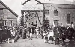 Smetona's father died in 1885 when Smetona was only 11 years old and, despite financial difficulties, a year later Smetona – the only of his siblings – was sent to the primary school in Taujėnai, where instruction was in Russian due to the Lithuanian press ban.[7] This was his dying father's request.[8] His mother hoped that Smetona would become a priest.[9] After graduation in 1889, Smetona wanted to continue his education, but gymnasiums admitted pupils only up to the age of 12 and he was already 15 years old. Therefore, he was forced to study privately in Ukmergė in order to catch up and be able to pass examinations to enter the fourth class of gymnasium.[10] In summer 1891, he attempted to gain admission to the Liepāja Gymnasium as his brother Motiejus worked in a factory in Liepāja.[11] He was refused and instead applied to the Palanga Progymnasium, which had no age restrictions.[12] Smetona was an exemplary student (one of the top two students) and received a tuition waiver. As a superintendent of a student dormitory, he also received free housing and was able to support himself by providing private lessons.[13] Three other future signatories of the Act of Independence of Lithuania attended the progymnasium at the same time: Steponas Kairys, Jurgis Šaulys, and Kazimieras Steponas Šaulys.[14] As Palanga was close to East Prussia, it was easier to obtain Lithuanian literature, which was banned by the Tsarist authorities. Smetona began reading Lithuanian periodicals and books, including a history of Lithuania by Maironis.[15]