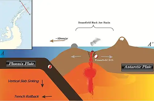 There are various volcanoes in the islands around the Antarctic Peninsula. This volcanism is related to extensional tectonics in Bransfield Rift to the west and Larsen Rift to the east.[17]