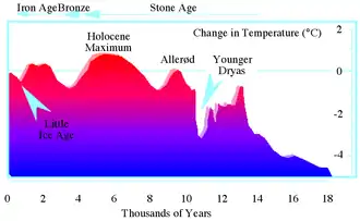 The deglaciation of the Antarctic Peninsula largely occurred between 18,000 and 6,000 years ago as an interglacial climate was established in the region. It initially started about 18,000 to 14,000 years ago with retreat of the ice sheet from the Pacific outer continental shelf and the continental margin within the Weddell Sea. Within the Weddell Sea, the transition from grounded ice to a floating ice shelf occurred about 10,000 years ago. The deglaciation of some locations within the Antarctic Peninsula continued until 4,000 to 3,000 years ago. Within the Antarctic Peninsula, an interglacial climatic optimum occurred about 3,000 to 5,000 years ago. After the climate optimum, a distinct climate cooling, which lasted until historic times, occurred.[27][28][31][32]