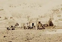 On 22 January 1840, two days after the discovery of the coast west of the Balleny Islands, some members of the crew of the 1837–1840 expedition of the French explorer Jules Dumont d'Urville disembarked on the Dumoulin Islands, off the coast of Adélie Land, where they took some mineral, algae, and animal samples, erected the French flag, and claimed French sovereignty over the territory.[164] The American captain Charles Wilkes led an expedition in 1838–1839 and was the first to claim he had discovered the continent.[165] The British naval officer James Clark Ross failed to realise that what he referred to as "the various patches of land recently discovered by the American, French and English navigators on the verge of the Antarctic Circle" were connected to form a single continent.[166][167][168][note 5] The American explorer Mercator Cooper landed on East Antarctica on 26 January 1853.[171]
