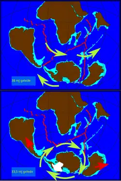 During the early Paleogene, the Antarctic land bridge continued to connect Antarctica with South America as well as to southeastern Australia. Fauna from the La Meseta Formation in the Antarctic Peninsula, dating to the Eocene, is very similar to equivalent South American faunas; with marsupials, xenarthrans, litoptern, and astrapotherian ungulates, as well as gondwanatheres and possibly meridiolestidans.[51][52] Marsupials are thought to have dispersed into Australia from South America via Antarctica by the early Eocene.[53]