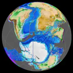 The Antarctic Peninsula began to form during the Jurassic period (206 to 146 million years ago).[40] Africa separated from Antarctica in the Jurassic around 160 Ma, followed by the Indian subcontinent in the early Cretaceous (about 125 Ma).[41] Ginkgo trees, conifers, Bennettitales, horsetails, ferns and cycads were plentiful during the time.[42] About 80 million years ago, flowering plants became the most diverse groups of plants on the continent.[43] In West Antarctica, coniferous forests dominated throughout the Cretaceous period (146–66 Ma), though southern beech trees (Nothofagus) became prominent towards the end of the Cretaceous.[44][45] Ammonites were common in the seas around Antarctica, and dinosaurs were also present, though only a few Antarctic dinosaur genera (Cryolophosaurus and Glacialisaurus, from the Early Jurassic Hanson Formation of the Transantarctic Mountains,[46] and Antarctopelta, Trinisaura, Morrosaurus and Imperobator from Late Cretaceous of the Antarctic Peninsula) have been described.[47][48][49][50]