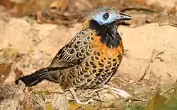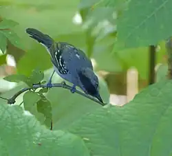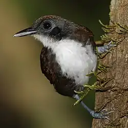 The plumage of antbirds is soft and not brightly coloured, although it is occasionally striking.[5] The colour palette of most species is blackish shades, whitish shades, rufous, chestnut and brown. Plumages can be uniform in colour or patterned with barring or spots. Sexual dimorphism – differences in plumage colour and pattern between males and females – is common in the family. Overall the pattern within the family is for the males to have combinations of grey, black or white plumage and the females having buff, rufous and brown colours. For example, the male dot-winged antwren is primarily blackish, whereas the female has rust-coloured underparts.[8] In some genera, such as Myrmotherula, species are better distinguished by female plumage than by male.[9] Many species of antbirds have a contrasting 'patch' of white (sometimes other colours) feathers on the back (known as interscapular patches), shoulder or underwing. This is usually concealed by the darker feathers on the back but when the bird is excited or alarmed these feathers can be raised to flash the white patch. dot-winged antwrens puff out white back patches, whereas in bluish-slate antshrikes and white-flanked antwrens the white patch is on the shoulder.[10]