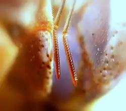 The common ancestor of all arthropods likely had one pair of uniramous (unbranched) antenna-like structures, followed by one or more pairs of biramous (having two major branches) leg-like structures, as seen in some modern crustaceans and fossil trilobites.[3] Crustaceans have two pairs of antennae, and all non-crustacean arthropods have a single pair of antennae, except for the chelicerates and proturans, which have none.[4]